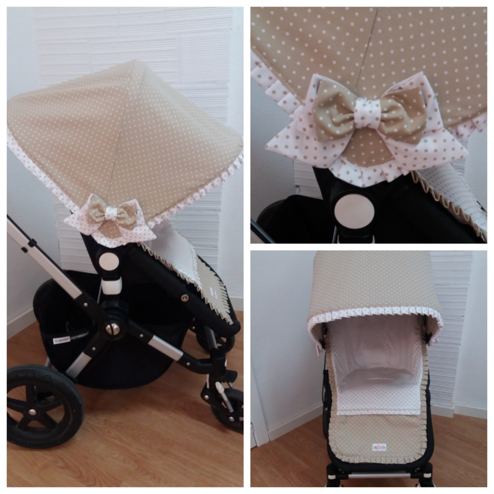 Capota, cubrecuco, cubrepies y saco para el Bugaboo Buffalo de Ángela, en piqué a topitos tono piedra. La elegancia hecha carro!